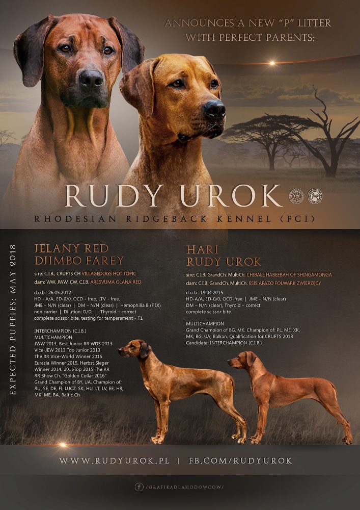 - zdrowie przyszłych szczeniąt (szczegółowo analizując m.in. badania genetyczne, badania pod kątem dysplazji oraz poprzednie mioty rodziców – nie występowały w nich żadne problemy zdrowotne). Rodzice tego miotu (i tym samym szczenięta) wolne są m.in. od dość powszechnej wśród rodezjanów młodzieńczej epilepsji (Juvenile Myoclonic Epilepsy),